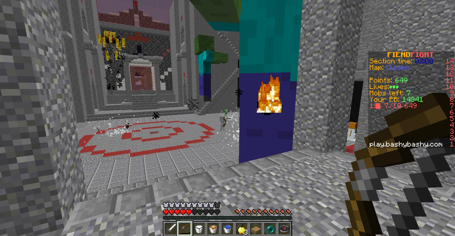 Your compass shows a particle trail to the nearest mob. If you can’t find the last couple of mobs with it, or if they’re too far away, force them to teleport to you – buy a fishing rod to reel them in before you run out of time.